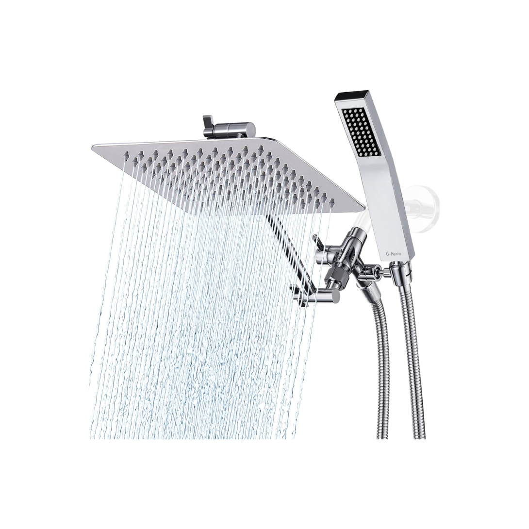 Experience a superior shower with the G-Promise All-Metal 8-Inch Dual Square Combo, featuring a high-pressure rainfall head and a versatile handheld wand. Built with durable stainless steel and brass components, it includes an adjustable extension arm and a smooth 3-way diverter for ultimate control. Upgrade your bathroom today and click to discover unmatched quality.