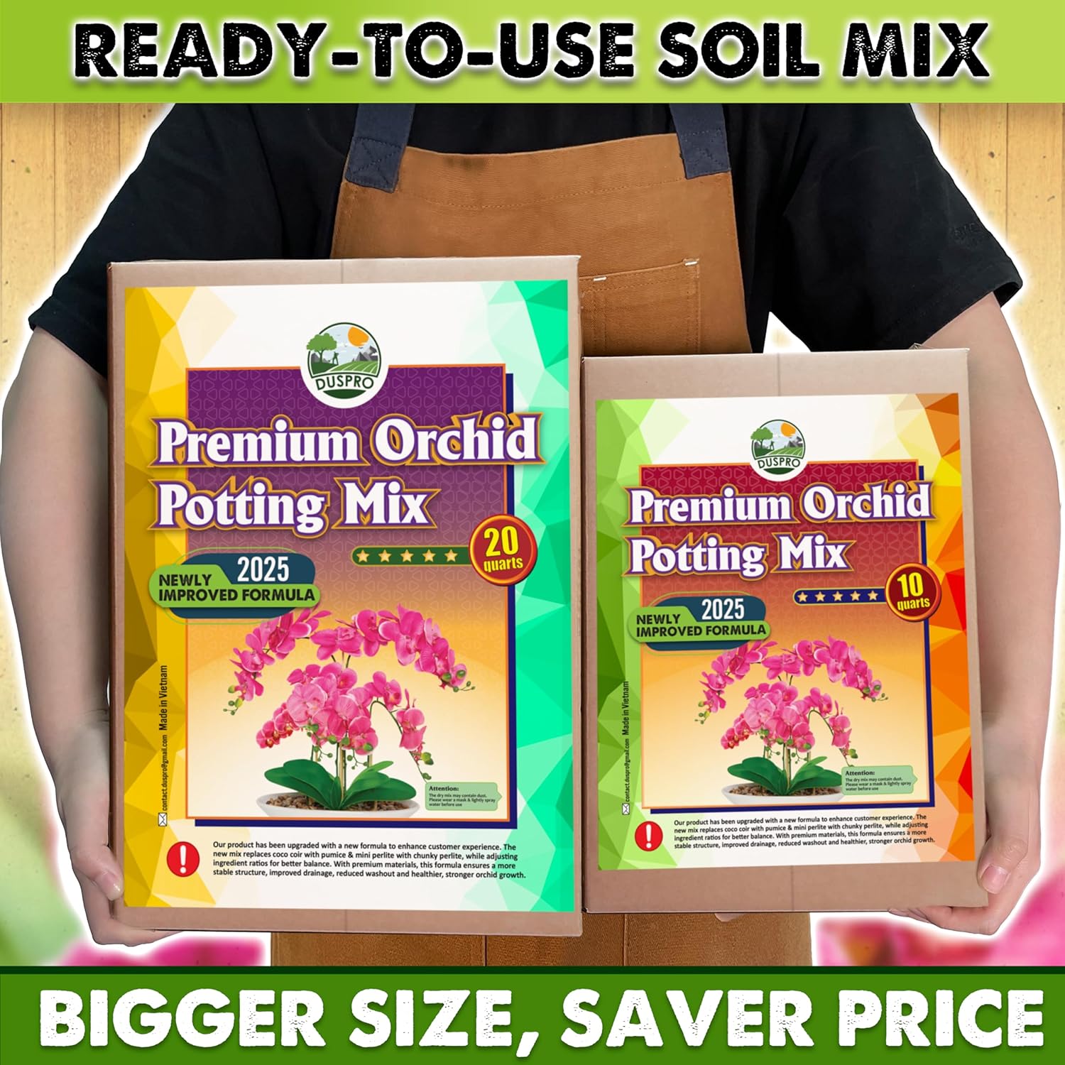 The DUSPRO Orchid Potting Mix offers a professional-grade blend of forest moss, pine bark, perlite, and pumice for superior aeration and moisture control. Designed for healthy root growth, it ensures excellent drainage and prevents overwatering, helping orchids thrive indoors. Perfect for repotting Phalaenopsis, Cattleyas, and other orchid varieties, this upgraded 20QT mix keeps your plants strong and vibrant. Repot with confidence using DUSPRO’s premium mix today!