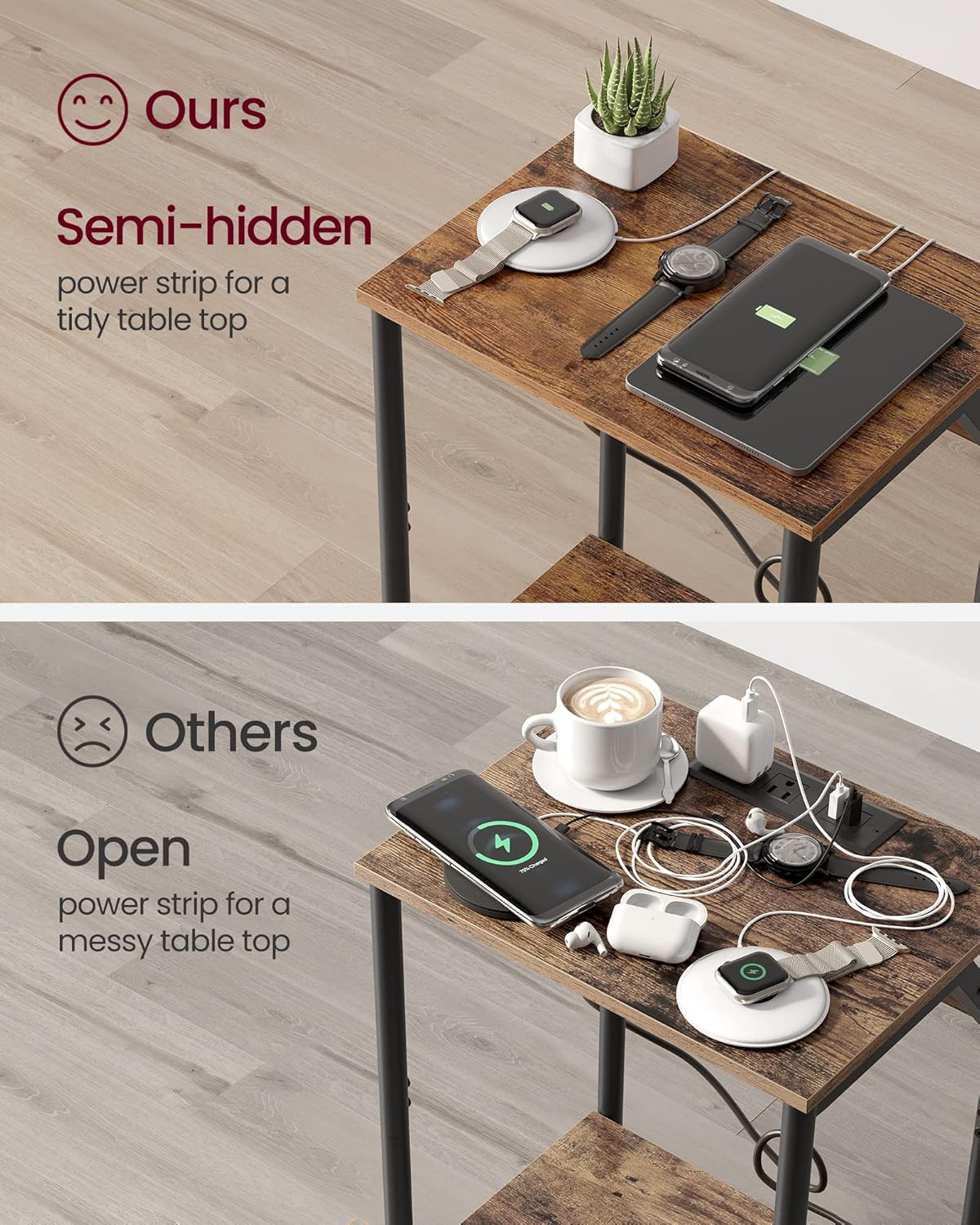 Perfect for small apartments, dorms, or narrow gaps, these slim side tables measure just 11.8″D x 15.2″W x 18.9″H.6 The compact dimensions ensure a snug fit without sacrificing utility.7 Each table features a sturdy tabletop and a convenient bottom storage shelf, offering organized space for books, remotes, and essential decor.8 The clever design includes slanted power panels and small gaps to neatly route charging cables, keeping your space tidy.9